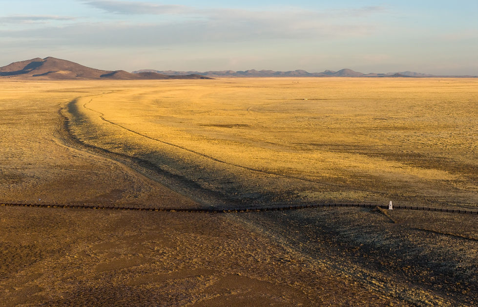 The landscape surrounding monument 229 markedly contrasts with the slums surrounding monument 222 - that lies just 12 miles to the east. This monument is situated on an elevated plateau, with wild stallions and a nearby wind farm.